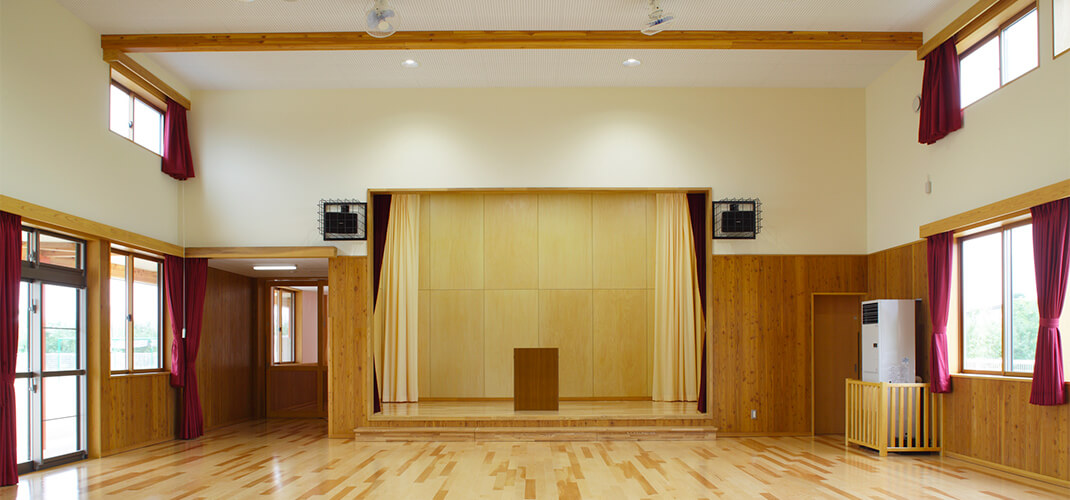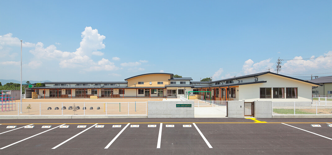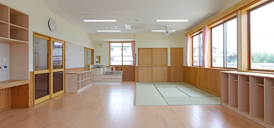 外観は和のテイストで落ち着きがある雰囲気ながらも、遊具などは黄色、緑、青、ピンクなどカラフルな色を使用し、子供たちが楽しく過ごせる工夫をしています。