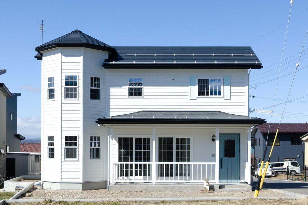 青空に映える白亜の外観と、多角形の塔屋が目を引くラップサイディングの住まい。