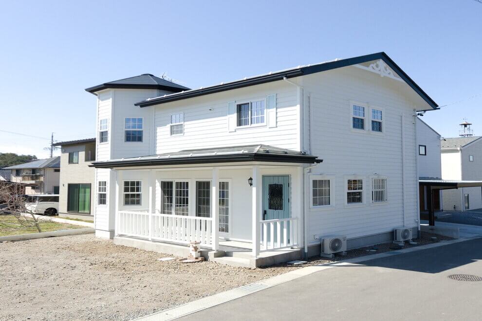 白亜の外観にパステルのアイテムが映える、塔屋が印象的なアメリカン・スタイルの家