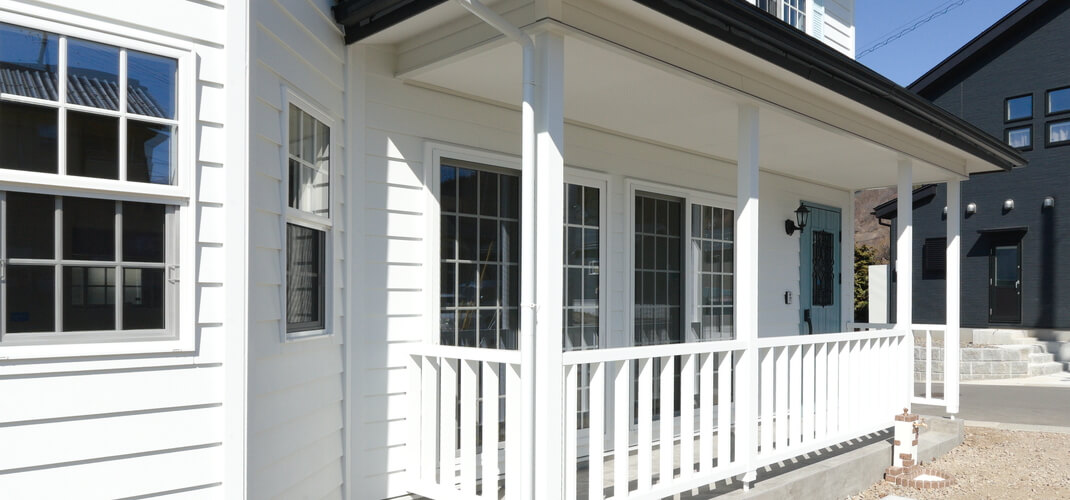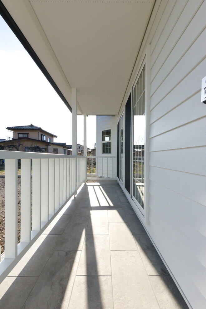 デッキ内部は、ラップサイディングに落ちる柵の影が美しい、洗練されたアメリカンスタイル。