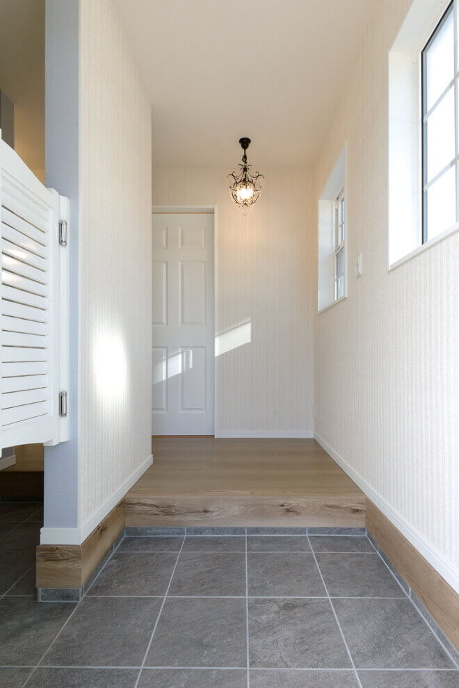 立体感のある白の腰壁とクラシカルな柄の壁紙、そして照明にお施主様のこだわりが反映されて、空間に奥行きと品格を与えています。
