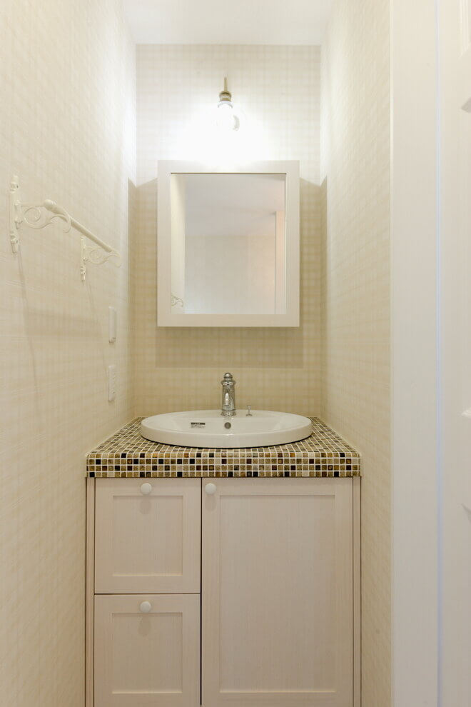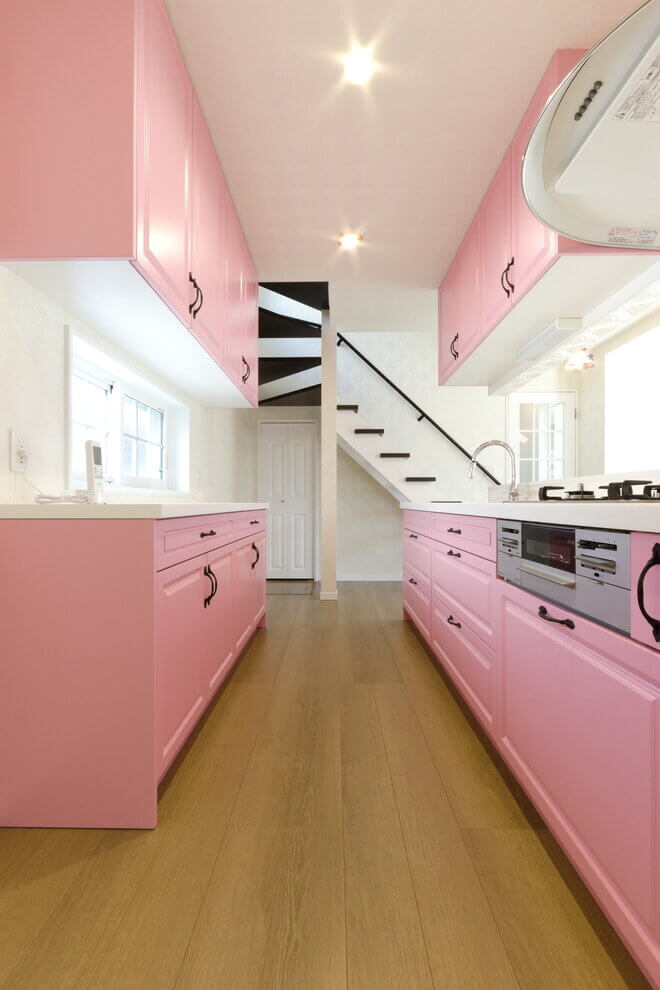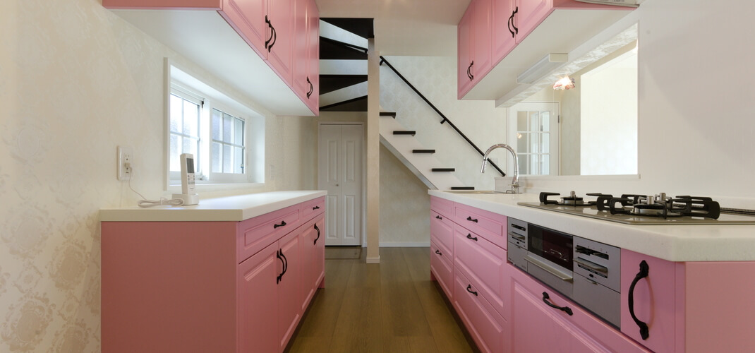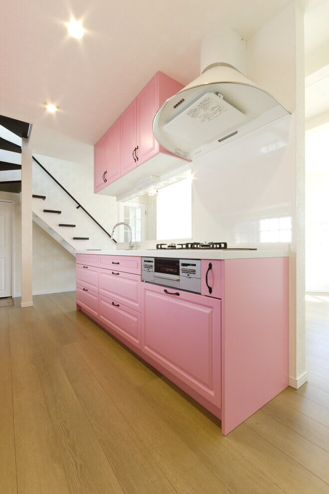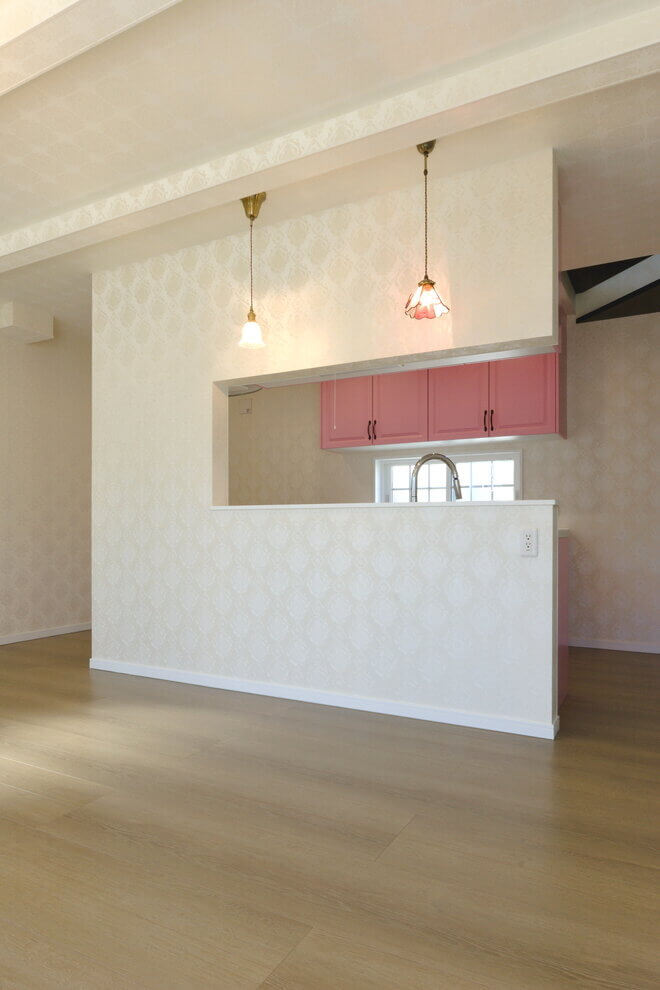 腰壁を施したクラシカルな空間に対し、キッチンには艶消しで落ち着いたピンクを採用し、毎日の家事に彩りを。