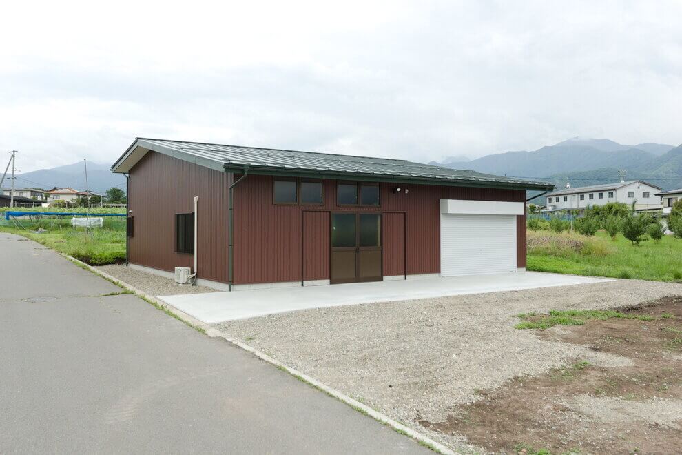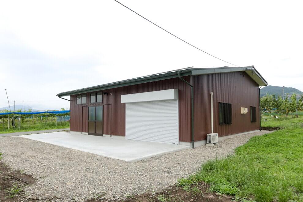 ブドウやりんご等の果樹畑に囲まれた場所に位置する、農作業・集出荷の拠点となる作業所です。